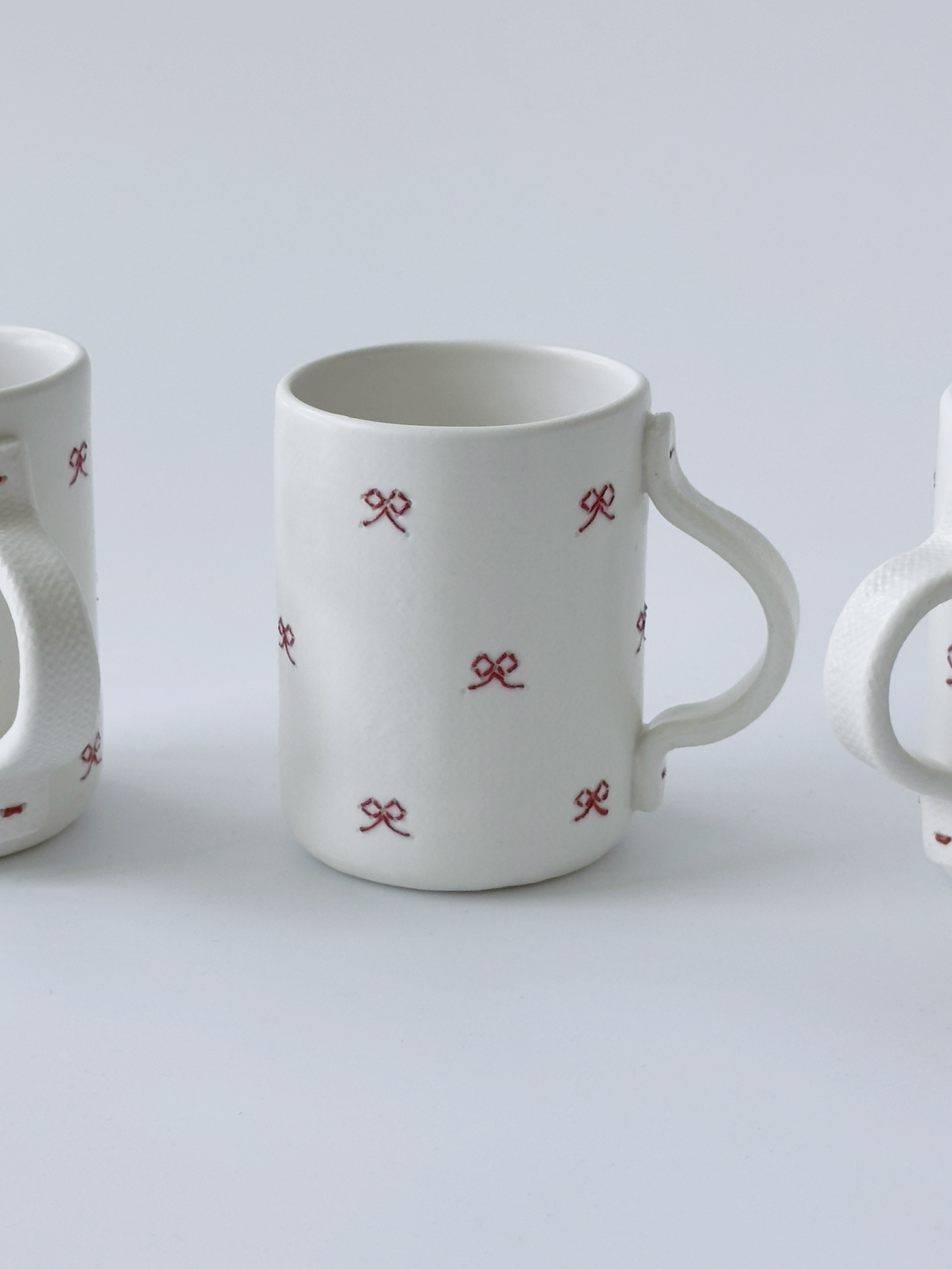 귀여운 리본이 앙증맞게 둘러진 머그 컵입니다.