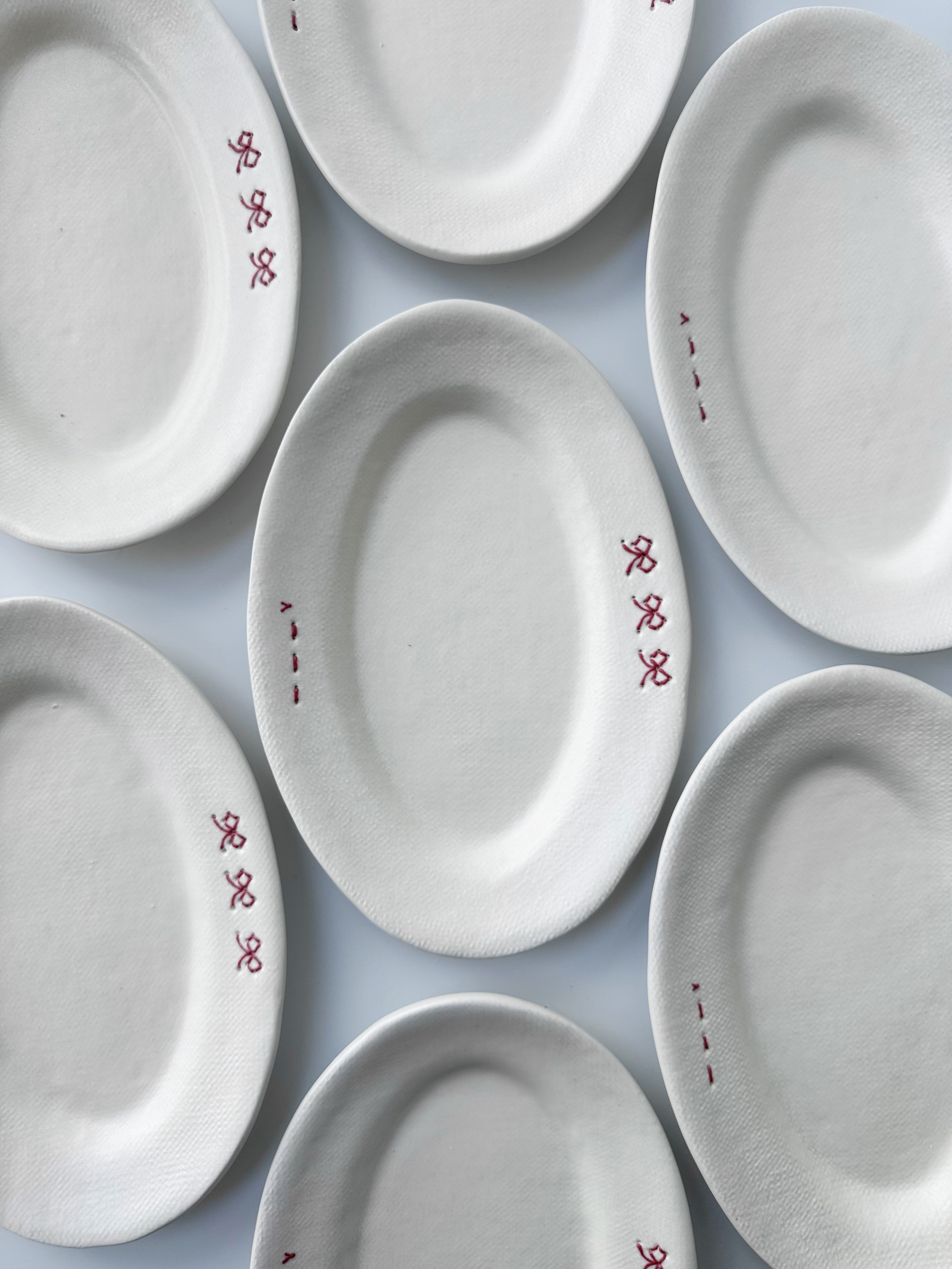 실로 꿰매듯 흙으로 하나하나 새긴 스티치와 바탕에 은은히 깃든 입체적 패턴은 단단한 재질임에도
