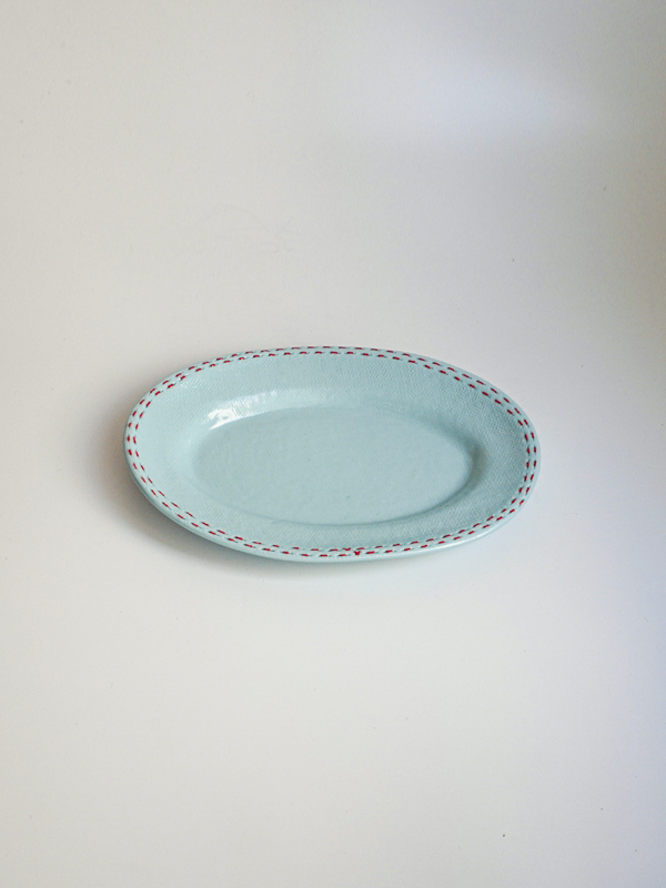 탁토크라프트의 스카이블루 톤에 빨간 스티치가 포인트 인 접시입니다.