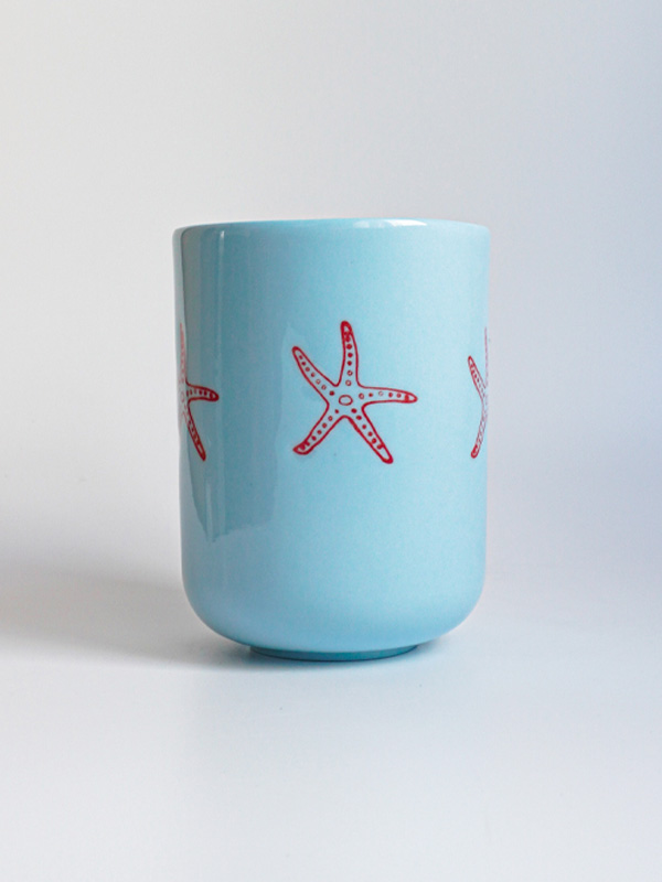 하늘색 바탕에 빨간 불가사리가 둘러싸고 있어요