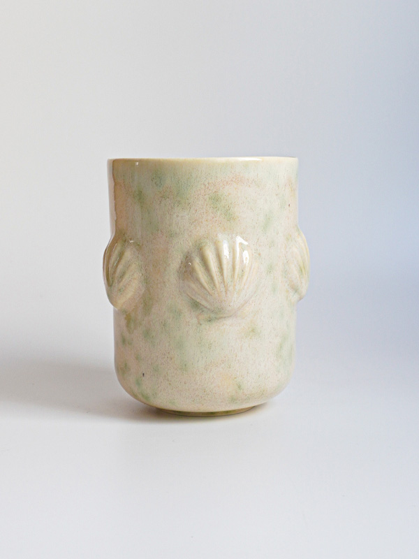 양각의 조개가 둘러져있고 초록색 점들이 매력적인 컵이에요.